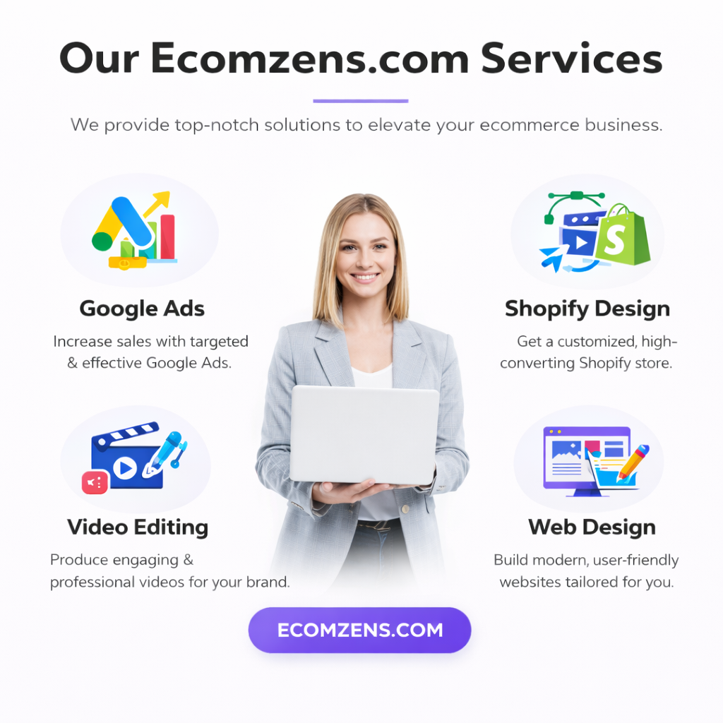 Ecomzens provides digital marketing, web design, Shopify design, AI automation, and video editing. We focus on building a connected digital system instead of random separate tasks.